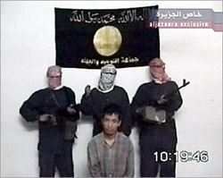 20日晚,阿拉伯“半島”電視臺播放了一段錄影帶,畫面上的武裝份子稱,除非韓國保證在24小時(shí)內(nèi)停止派兵赴伊拉克,否則他們將把一名韓國人質(zhì)斬首。綁架人質(zhì)的武裝分子自稱屬于“團(tuán)結(jié)圣戰(zhàn)組織”。該組織曾多次通過電子郵件向半島電視臺發(fā)送綁架人質(zhì)的錄像片段,或在其網(wǎng)站上聲稱對某一襲擊事件負(fù)責(zé)。據(jù)稱,該組織由恐怖頭目扎卡維領(lǐng)導(dǎo),與“基地”組織有聯(lián)系。