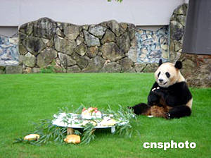 東京時間二十日下午四時正,由竹子、香蕉、蘋果組成的一個特大“水果蛋糕”擺放到白浜野生動物園熊貓館的戶外草坪上。在陣陣掌聲中,“雄浜”慢慢地走來,靜靜地坐在“蛋糕”前享受起來。此時,上千名日本游客揮舞著中日雙方的國旗,為“雄浜”送行。