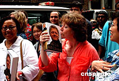在書店外排隊等候克林頓簽名的斯維珍尼亞親吻回憶錄封面上的克林頓,表示對這位前美國總統(tǒng)的喜愛。