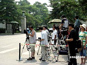 在成群的記者隊伍旁邊,還另有一道風景線。比起略顯緊張的記者群,一旁的這群人則顯得相對安逸。其中,一位六十三歲的老者告訴記者,他住在附近,第一次六方會談他就過來看了,這次也過來“關心一下國家大事”。一旁還有兩位學生模樣的人,詢問后得知,一個是清華大學的學生,一個是北京交通大學的學生,適逢考試結束,這兩位高中時代的同學今天結伴,到這里“開開眼界”。