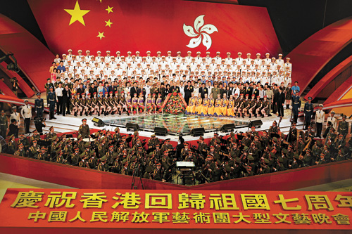 中新網(wǎng)6月24日電 據(jù)香港大公報(bào)報(bào)道,中國人民解放軍藝術(shù)團(tuán)昨晚在香港紅磡體育館舉行“慶祝香港回歸七周年大型文藝晚會(huì)”首場(chǎng)演出。特區(qū)行政長(zhǎng)官董建華、中央駐港聯(lián)絡(luò)辦主任高祀仁,副主任李剛,外交部駐港特派員楊文昌、解放軍駐港部隊(duì)司令員王繼堂、政委王玉發(fā),特區(qū)律政司司長(zhǎng)梁愛詩等出席觀看了晚會(huì)。