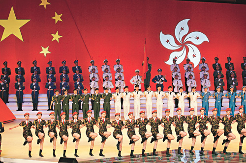 在“香港你好”一章中,藝術(shù)團(tuán)還特別演唱了“獅子山下”、“東方之珠”等反映香港市民生活和自強(qiáng)不息的歌曲!皵y手踏平崎嶇……用艱辛努力寫下那不朽香江名句”,市民熟悉的歌詞在場(chǎng)內(nèi)回旋,這是香港人的心聲,也是藝術(shù)團(tuán)對(duì)香港的美好祝愿,數(shù)千名觀眾以如潮的掌聲熱烈回應(yīng)藝術(shù)家們的深情祝福。