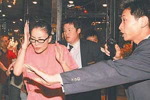 王菲和其助理、孫楠、李亞鵬乘林肯車回酒店,計(jì)劃由孫楠充當(dāng)攝影記者的擋箭牌,分散注意力,保護(hù)二位順利上樓?墒且饬现獾氖,在酒店門外,十多位王菲的歌迷,苦等了一夜,依舊站在那里不停地呼喊,氣勢(shì)不減;還有,記者的兩臺(tái)車始終分隔在林肯轎車的前后,原本要躲避影迷從酒店員工通道進(jìn)入的林肯轎車不得不兜了一大圈后,?吭诰频暾T。歌迷瘋狂到了極點(diǎn),孫楠根本無(wú)法引開火力,緊要關(guān)頭,一向低調(diào)的王菲親自掩護(hù)起李亞鵬來(lái)。