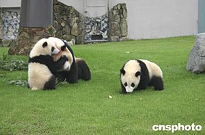 六月下旬,世界第一對(duì)由母體同時(shí)撫育長大的大熊貓“隆浜”和“秋浜”與母親“梅梅”在日本和歌山白浜野生動(dòng)物園草坪上玩耍。這對(duì)雙胞胎二零零三年九月八日出生在日本,“隆浜”現(xiàn)在體重已達(dá)十七點(diǎn)九公斤,“秋浜”達(dá)十九點(diǎn)三五公斤,體態(tài)嬌憨,十分惹人喜愛。一般說來,熊貓產(chǎn)下雙胞胎,由于顧此失彼,很難由母體成功地?fù)嵊W髡?肖龍聯(lián)