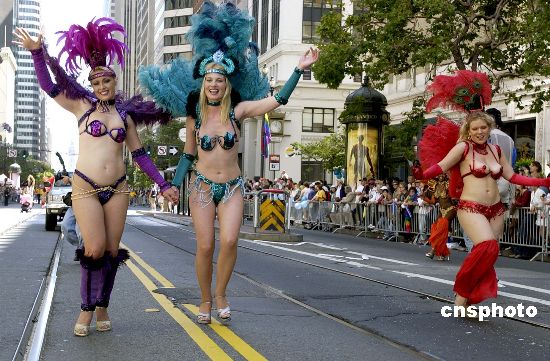 美國舊金山市六月二十七日舉行第三十四屆同性戀“自豪大游行”。圖為盛裝打扮的女子手拉手參加游行。陳鋼 攝