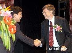 微軟公司董事長(zhǎng)兼首席軟件架構(gòu)師比爾·蓋茨,7月1日出席在北京舉行的2004微軟新技術(shù)展望大會(huì),并為2500余名大學(xué)生及2000位軟件開發(fā)人員演講,并共同探討未來無縫計(jì)算的發(fā)展趨勢(shì)。圖為微軟亞洲研究院院長(zhǎng)沈向洋(左)與比爾·蓋茨握手。中新社記者:張宇