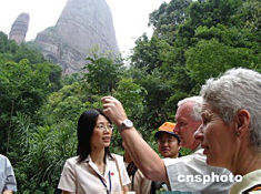 七月五日,廣東韶關(guān)市政府為中國丹霞山世界地質(zhì)公園舉行隆重的揭碑開園儀式后,聯(lián)合國官員在丹霞山陽元山景區(qū)參觀考察。作者:馮昶