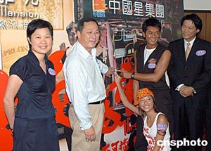 港產(chǎn)電影《柔道龍虎榜》兩位男女主角古天樂、應(yīng)釆兒及導(dǎo)演杜琪峰7月7日在香港出席樓盤長(zhǎng)旺雅苑「電影預(yù)展中心」揭幕儀式,并主持亮燈儀式。作者:鄧慶樂