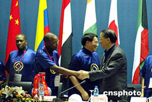 為期十天的第二十八屆世界遺產(chǎn)委員會(huì)會(huì)議七月七日在蘇州順利閉幕。閉幕式上通過(guò)了下屆世遺大會(huì)主席的選舉議程,南非的丹巴·瓦卡什當(dāng)選第29屆世界遺產(chǎn)委員會(huì)會(huì)議的主席。圖為章新勝與丹巴·瓦卡什握手(左)。作者:蔣振江