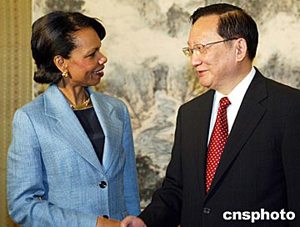 中國(guó)國(guó)務(wù)委員唐家璇,七月九日在北京會(huì)見美國(guó)總統(tǒng)國(guó)家安全事務(wù)助理康多莉扎·賴斯。中新社記者:鄭萍萍