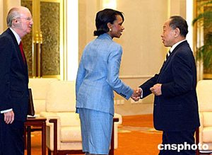 七月九日,繼續(xù)在北京訪問的美國(guó)總統(tǒng)國(guó)家安全事務(wù)助理賴斯與中國(guó)外交部部長(zhǎng)李肇星互致問候,賴斯將于當(dāng)天中午離開北京赴漢城繼續(xù)她的亞洲之行。中新社記者:鄭萍萍