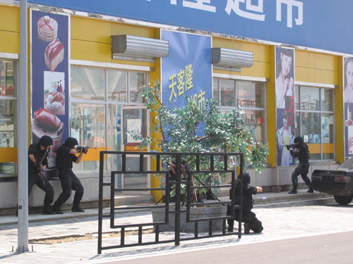在模擬街區(qū)破襲劫案中,場(chǎng)內(nèi)觀摩人士皆有身臨其境之感。三名蒙面持槍和爆炸物的“歹徒”從黑色小轎車魚貫跳下,闖入銀行內(nèi)進(jìn)行搶劫,隨著一聲槍響,模擬街區(qū)銀行搶劫案發(fā),民眾慌亂撤離,“歹徒”搶劫得逞后駕車逃離現(xiàn)場(chǎng)。特警隊(duì)員接到報(bào)警后迅速趕到現(xiàn)場(chǎng)。最先趕到的步巡小組和陸續(xù)到達(dá)的巡邏車組相互配合,開展堵截。犯罪嫌疑人開槍拒捕,逃到一家商店內(nèi)繼續(xù)與警方對(duì)抗。警方包圍商店后,特警采取各種單兵和小組戰(zhàn)術(shù)接近商店,選擇時(shí)機(jī)向屋內(nèi)投擲爆震彈并迅速出擊,同時(shí)抓獲犯罪嫌疑人。
