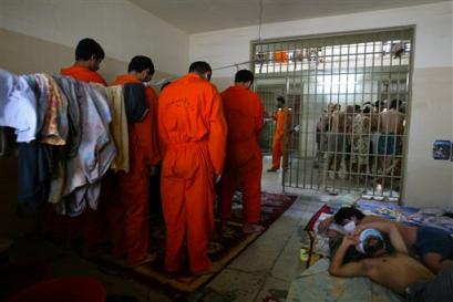 曾發(fā)生美軍虐待政治犯事件的1A和1B囚室目前關(guān)押著鬧事者和問題犯人。監(jiān)獄內(nèi)由伊拉克控制的監(jiān)區(qū)共關(guān)押有1200名犯人。在大多數(shù)囚室里,由于夏天溫度很高,犯人們都毫無(wú)生氣地躺在地上的泡沫床墊上,多數(shù)人穿著白色的長(zhǎng)短褲或者更少的衣服。