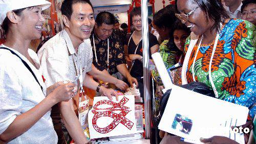 中國著名影星濮存昕(左二)、蔣雯麗七月十二日在第十五屆世界艾滋病大會中國展位上向觀眾推薦預(yù)防艾滋病中國剪紙——“紅絲帶”。中新社記者:曾利明