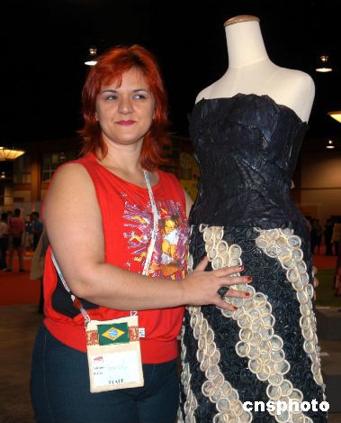 二○○四年七月,第十五屆艾滋病大會展出的巴西藝術工作者愛德羅娜·波特尼用安全套制作十八套時裝,其中有八套已被高價購買。圖為愛德羅娜與自己的得意之作。中新社記者:曾利明