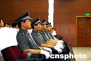 “一二·二三”特大井噴事故案今天繼續(xù)在重慶市第二中級(jí)人民法院進(jìn)行庭審,該庭審已進(jìn)入第二天。圖為法庭上的法警。作者:鄒輝