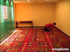 七月十五日,二零零四年中國亞洲杯足球賽重慶賽區(qū)舉行了指定下榻酒店揭牌儀式,為尊重不同國家的宗教和風(fēng)俗習(xí)慣,指定酒店還準(zhǔn)備了禱告房。圖為工作人員正在布置重慶賽區(qū)球隊(duì)下榻酒店內(nèi)的禱告房。二零零四年中國亞洲杯足球賽將于七月十七日正式開幕。作者:郭晉嘉
