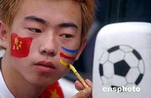七月十七日,二零零四年亞洲杯足球賽揭幕戰(zhàn)將在中國隊(duì)和巴林隊(duì)之間展開,一位中國球迷認(rèn)真描畫臉譜,為中國隊(duì)加油。中新社記者:武仲林