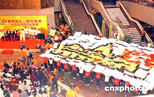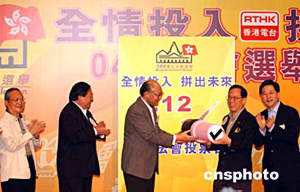 政務(wù)司司長曾蔭權(quán) 、政制事務(wù)局局長林瑞麟、民政事務(wù)局局長何志平、選舉管理委員會主席胡國興大法官及立法會議員、區(qū)議會正、副主席、選舉大使等出席典禮。  2004年香港立法會選舉開幕典禮17日在文化中心大堂舉行﹐政制事務(wù)局局長林瑞麟介紹選票。