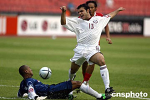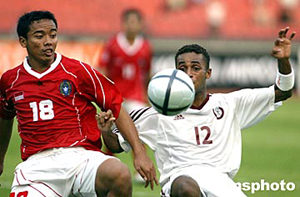 2004年亞洲杯足球賽A組第二場比賽卡特爾隊(duì)對印度尼西亞隊(duì)的比賽,7月18日在北京工人體育場賽進(jìn)行?ㄋ栮(duì)得勢不得分,最終被“黑馬”印度尼西亞隊(duì)以二比一戰(zhàn)勝。作者:盛佳鵬