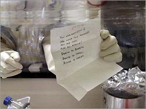 2001年發(fā)生的炭菌襲擊共造成5人死亡、17人受傷。911襲擊一個月后,沾有炭菌粉末的郵件被投寄到政府辦公室、新聞機構、紐約郵局和多名參議員,造成多家機構關閉,老百姓人心動蕩。目前還沒有一人因炭菌襲擊被起訴。