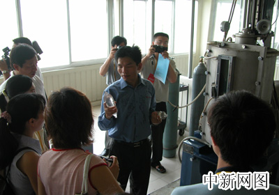 “網(wǎng)上河北行”采風(fēng)團(tuán)參觀訪問秦皇島經(jīng)濟(jì)技術(shù)開發(fā)區(qū)中的華博晶體技術(shù)有限公司,該公司抓住以藍(lán)寶石為襯底材料的藍(lán)色、綠色和白色LED和LD產(chǎn)業(yè)快速發(fā)展契機(jī),目前已發(fā)展為國內(nèi)最大的藍(lán)寶石生產(chǎn)基地。圖為該公司負(fù)責(zé)人向記者們展示產(chǎn)品加工過程。(秦欣攝)