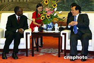二○○四年七月二十一日,中國國家副主席曾慶紅(右)在北京會(huì)見盧旺達(dá)外長穆里甘德(左)一行。中新社記者:鄭萍萍