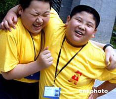 二○○四年七月二十一日,北京舉辦“世紀(jì)陽光‘小胖子’均衡營養(yǎng)運(yùn)動夏令營”活動,參加活動前孩子們合影留念。據(jù)悉,北京一些‘小胖子’的家長在暑假期間支付高額費(fèi)用把孩子送進(jìn)夏令營,旨在幫助他們減肥。中新社記者:宋吉河