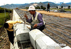 二○○四年七月下旬,筑路工人在西藏拉薩近郊青藏鐵路第三十一標(biāo)段鋪設(shè)路基、加固擋土墻,作鋪軌前的準(zhǔn)備。據(jù)專(zhuān)家理論預(yù)測(cè),青藏鐵路開(kāi)通后,到西藏旅游的人數(shù)將逐年增加一百萬(wàn)人次以上。作者:王麗南