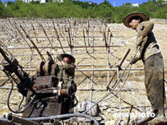 二○○四年七月仲夏,中國(guó)長(zhǎng)江三峽地區(qū)降雨量增多,部分地區(qū)出現(xiàn)泥石流和山體滑坡。為防止移民新城和三峽庫(kù)岸出現(xiàn)類(lèi)似隱患,奉節(jié)縣正抓緊時(shí)間治理沿江高邊坡工程。圖為進(jìn)入伏季以來(lái),雨后初晴之時(shí),三峽地區(qū)奉節(jié)縣新縣城人民廣場(chǎng)高邊坡治理工地上,民工在暑熱中澆混泥漿。作者:周會(huì)