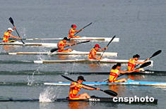 中國(guó)國(guó)家皮劃艇隊(duì)女子皮艇運(yùn)動(dòng)員七月二十七日在山東日照水庫(kù)訓(xùn)練基地進(jìn)行奧運(yùn)賽前模擬實(shí)戰(zhàn)訓(xùn)練,備戰(zhàn)雅典奧運(yùn)會(huì)。作者:張勤