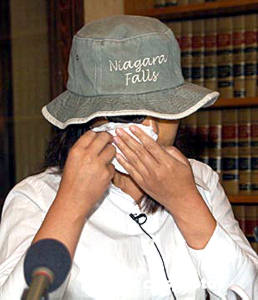 趙燕是被司機(jī)用輪椅推進(jìn)三樓的律師樓辦公室的,始終不摘掉的墨鏡和帽子遮住了她原本清秀的面龐,帽子上寫(xiě)著傷心地“尼亞加拉瀑布”!拔业哪槵F(xiàn)在是五顏六色的,不敢給你們看,怕嚇著你們!壁w燕說(shuō)話細(xì)聲慢語(yǔ),雖馳騁商場(chǎng),但不乏文靜氣質(zhì),說(shuō)到傷心處哽咽難語(yǔ)。