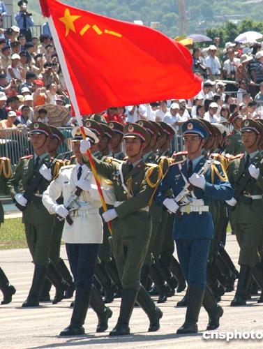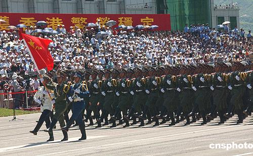 8月1日,香港回歸七年來,駐港部隊今天首次公開閱兵,包括政府高官、社會名流和眾多第二屆立法會議員在內(nèi)的逾一萬五千名香港市民,在新界石崗軍營親睹了陸?杖娪馊Ч俦鴧⒓拥年犃胁傺荨