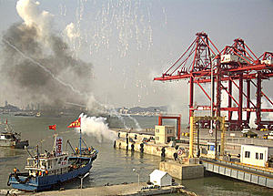 7月24日下午3時(shí)左右,隨著三發(fā)紅色信號(hào)彈升空,眾多艘民船商船在福建省廈門(mén)灣南岸的漳州港海面上集結(jié),船上裝載著武器裝備和人員,這些船迅速與海面部隊(duì)對(duì)接。