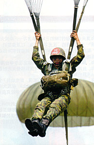 上午10時(shí)15分起,臺(tái)200多名空降兵在潮州鎮(zhèn)進(jìn)行了代號(hào)“聯(lián)云”的空降演習(xí),稍后,他們還會(huì)同從加祿堂趕來(lái)的登陸演練人員一道,與趕來(lái)的“守軍”展開(kāi)了激戰(zhàn)……