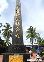二○○四年七月下旬,在海南興隆華僑農(nóng)場的亞洲熱帶風(fēng)情園里,豎立著兩尊黑色金字的柱子。據(jù)悉,它們是香港與澳門回歸紀(jì)念柱,這兩尊柱子是該風(fēng)情園的一大景觀。作者:顧時(shí)宏