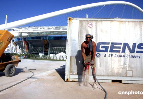 (當(dāng)?shù)貢r(shí)間)二○○四年八月二日上午,一名鉆工在希臘雅典奧運(yùn)會(huì)主會(huì)場(chǎng)外冒著烈日安裝配套設(shè)施,雅典奧運(yùn)會(huì)主會(huì)場(chǎng)建設(shè)工程已經(jīng)收尾。中新社記者:任晨鳴