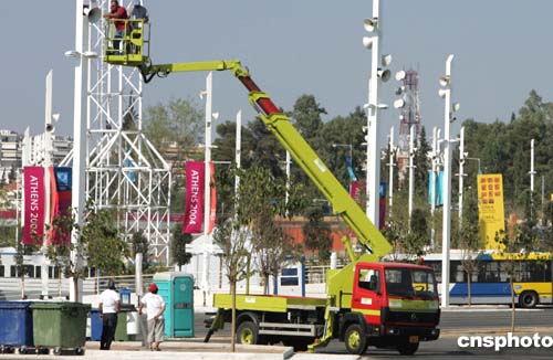 (當(dāng)?shù)貢r(shí)間)二○○四年八月三日,希臘雅典奧運(yùn)會(huì)主體育場外的配套工程緊張進(jìn)行,工人們冒著烈日安裝擴(kuò)音設(shè)施。中新社記者:任晨鳴