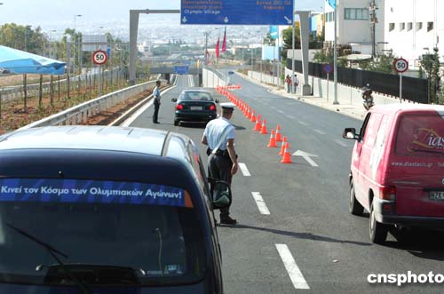 (當(dāng)?shù)貢r間)二○○四年八月三日,位于希臘雅典市郊的奧運村入口由警方嚴(yán)加把守。中新社記者:任晨鳴