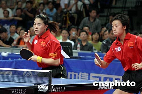 中國國家乒乓球隊(duì)出征雅典奧運(yùn)會(huì)前最后一次熱身賽二○○四年八月二日至三日在河北秦皇島市奧林匹克體育館舉行,八月三日晚女子雙打決賽王楠(左)、張怡寧以四比三勝郭躍、牛劍鋒獲得第一名。中新社記者:張勤