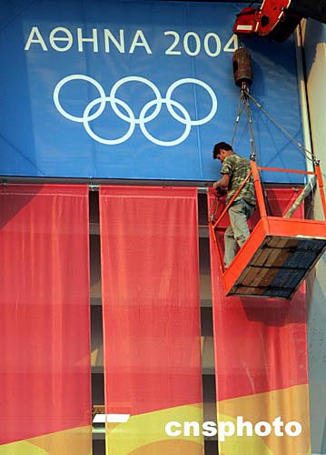 當(dāng)?shù)貢r間8月3日晚,一名建筑工人在雅典奧運會主體育場安裝加固旗幟,開幕式將于8月13日在這里舉行。中新社記者:任晨鳴