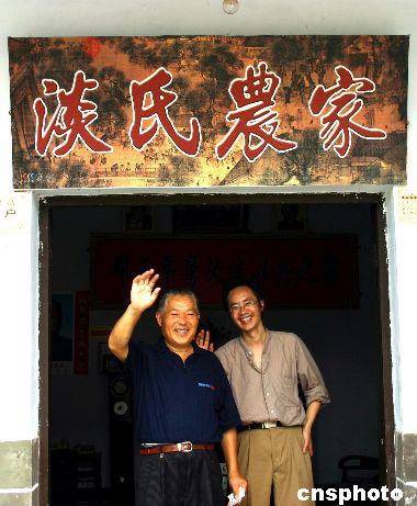 二○○四年八月四日,鄧小平百年誕辰即將到來,現(xiàn)年六十八歲的小平表弟淡文全在小平故鄉(xiāng)廣安牌坊新村經(jīng)營著自己的“淡氏農(nóng)家”,言表中洋溢著愉悅。圖為接受采訪后,淡文全與大女婿張遇春送別記者。作者:郭晉嘉