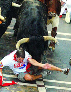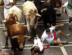 在西班牙的斗;顒又,旁普羅納鎮(zhèn)舉辦的奔牛節(jié)是一個高潮。該項活動起始于1850年,在每年的7月6日至7月14日期間舉行,每天一大早,成群的斗牛從柵欄中被放出,而大街上數(shù)以千計穿著旁普羅納傳統(tǒng)服裝的年輕男人和觀光客則冒著被牛只沖撞和踩踏的危險開始在牛群前拼命奔跑,要跑一公里長的路,一直跑到賽牛場才停止。