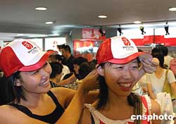 八月六日,北京兩名大學(xué)生專程來到北京王府井工藝美術(shù)商店的奧運(yùn)特許商品零售專柜前購(gòu)買自己喜愛的奧運(yùn)棒球帽,剛剛開業(yè)第二天的王府井工藝美術(shù)商店奧運(yùn)特許商品零售專柜前擠滿了前來購(gòu)買奧運(yùn)紀(jì)念品的市民。中新社記者:張勤