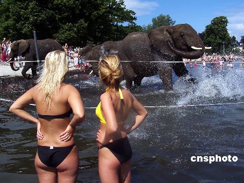 丹麥最近遭遇持續(xù)高溫天氣,動(dòng)物園中的大象難耐酷熱,飼養(yǎng)員帶領(lǐng)它們來(lái)到河中沖水納涼,引來(lái)許多好奇的人們駐足觀看。作者:Ic/cnsphoto