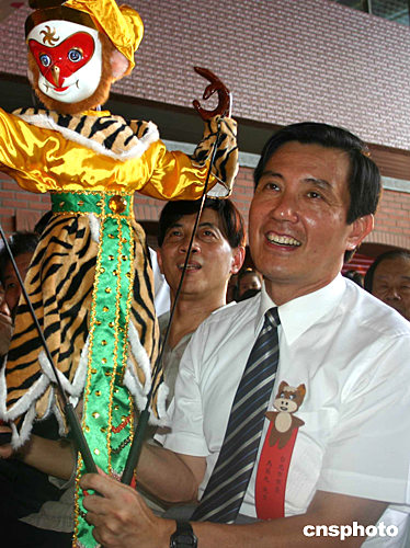 臺北偶戲館八月七日開張。圖為臺北市長馬英九手持一個孫悟空造型的戲偶出席開幕式。作者:董會峰
