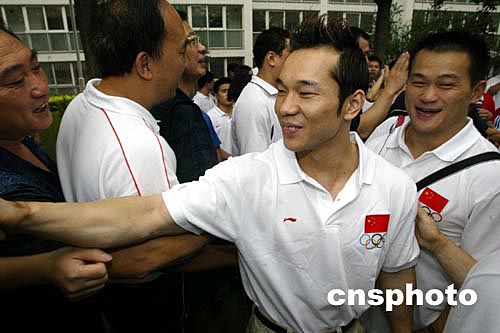 8月8日,中國奧運(yùn)軍團(tuán)齊聚北京出征2004雅典奧運(yùn)會(huì),中國舉重隊(duì)隊(duì)員樂茂盛(右二)和張國政(右一)在中國國家體育總局訓(xùn)練局和隊(duì)友話別。中新社記者:盛佳鵬