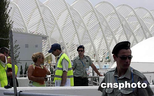 (當(dāng)?shù)貢r間)二○○四年八月八日,希臘保安人員在雅典奧林匹克體育場外執(zhí)行警戒任務(wù),確保奧運(yùn)會場內(nèi)外的安全。中新社記者:毛建軍