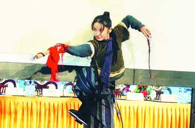 也許是受了最近幾部大片首映式的啟發(fā),昨晚《七劍》的發(fā)布會(huì)別開(kāi)生面幾乎成了一臺(tái)演出秀。一開(kāi)場(chǎng),《指環(huán)王》的電影音樂(lè)把徐克希望的“史詩(shī)般武俠”渲染得恰如其分,接著劇中扮演俠士的群眾演員穿著古裝輪番登場(chǎng)舞劍。在電影《少林寺》中有過(guò)出色表現(xiàn)的老演員于承惠,亮出了自己的絕活——現(xiàn)場(chǎng)揮墨寫下了“七劍下天山”幾個(gè)大字。