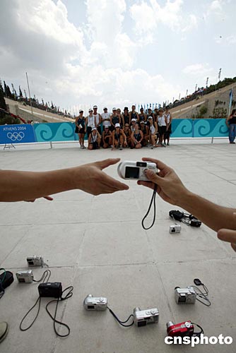 奧運(yùn)大戰(zhàn)前夕,新西蘭女子曲棍球隊(duì)8日在著名的大雅典運(yùn)動(dòng)場(chǎng)前合影留念,十幾臺(tái)數(shù)碼照相機(jī)一字排開,使攝影師成為最忙碌的人。中新社記者:王瑤